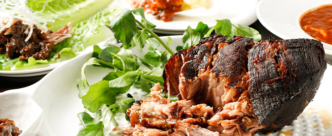 豚肉をじっくり特性ソースに漬け込み、お肉を崩してラフに召し上がれます